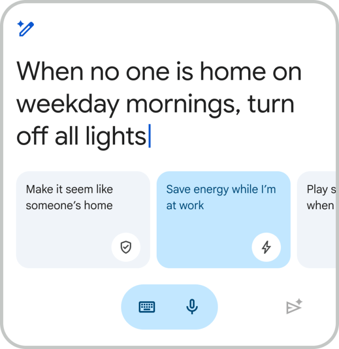 Gemini还能帮助用户轻松使用复杂功能:例如通过问答了解能耗情况,或自动执行控制多设备的预设场景。全新“Ask Home”功能支持语音配置自动化方案——当询问“如何提升居家安全感”时,系统会推荐独居安防模式或模拟有人在家的方案,并直接帮你完成设置。